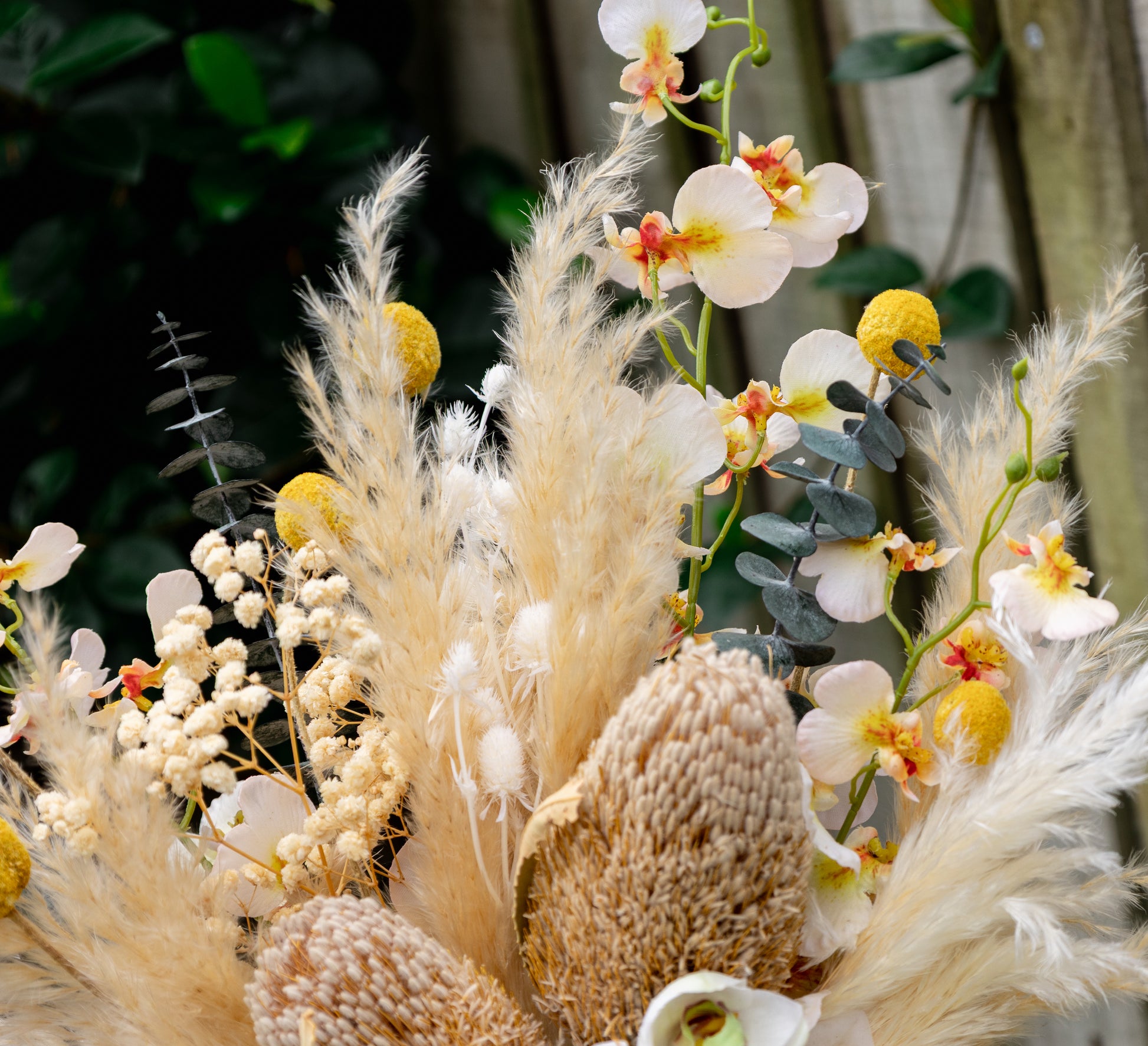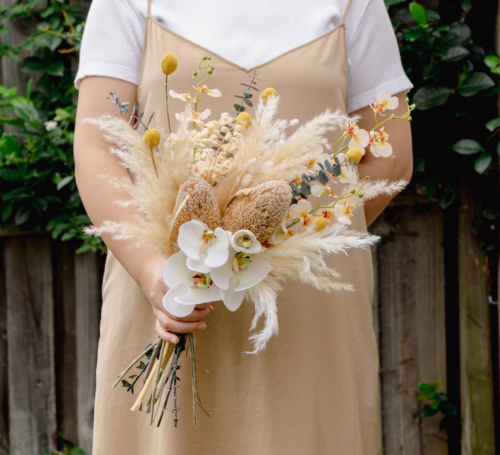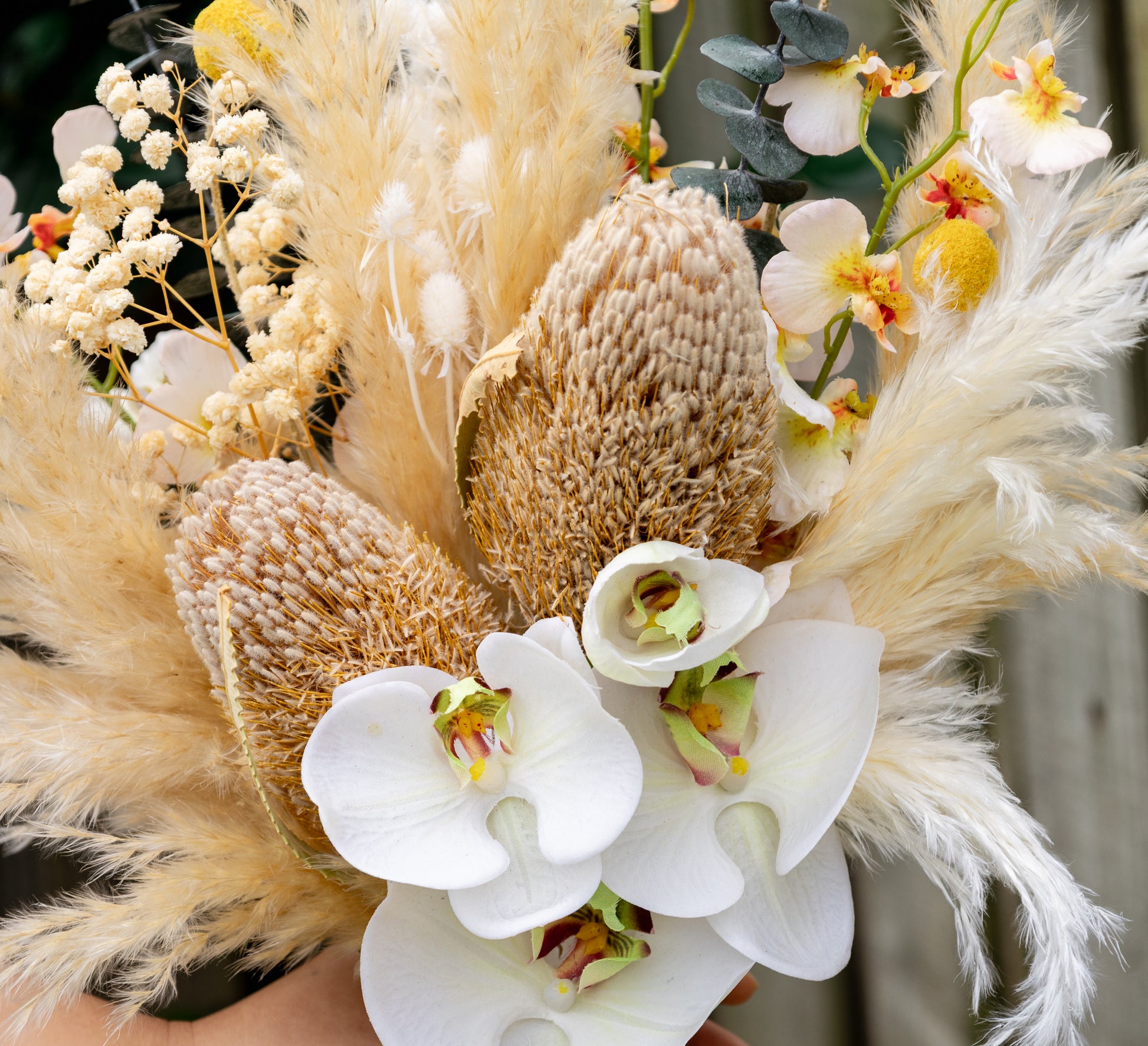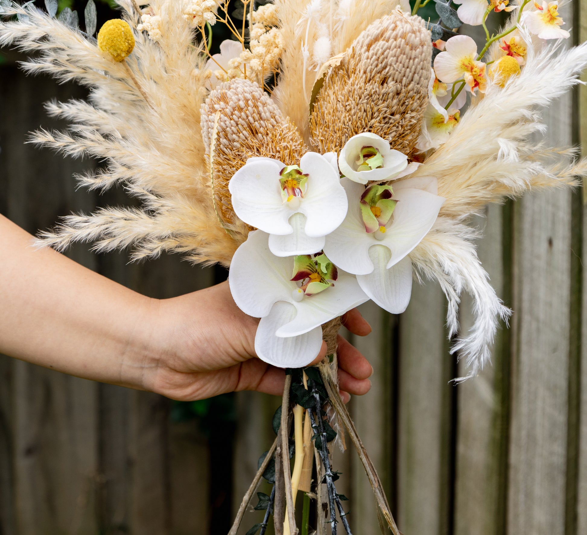 Earthy elegance meets modern romance in Desert Bloom, a dried flower bouquet that brings together native textures and soft orchid beauty. Featuring pampas grass, billy buttons, banksia, and ivory phalaenopsis orchids, this piece balances wild Australian elements with delicate luxury.