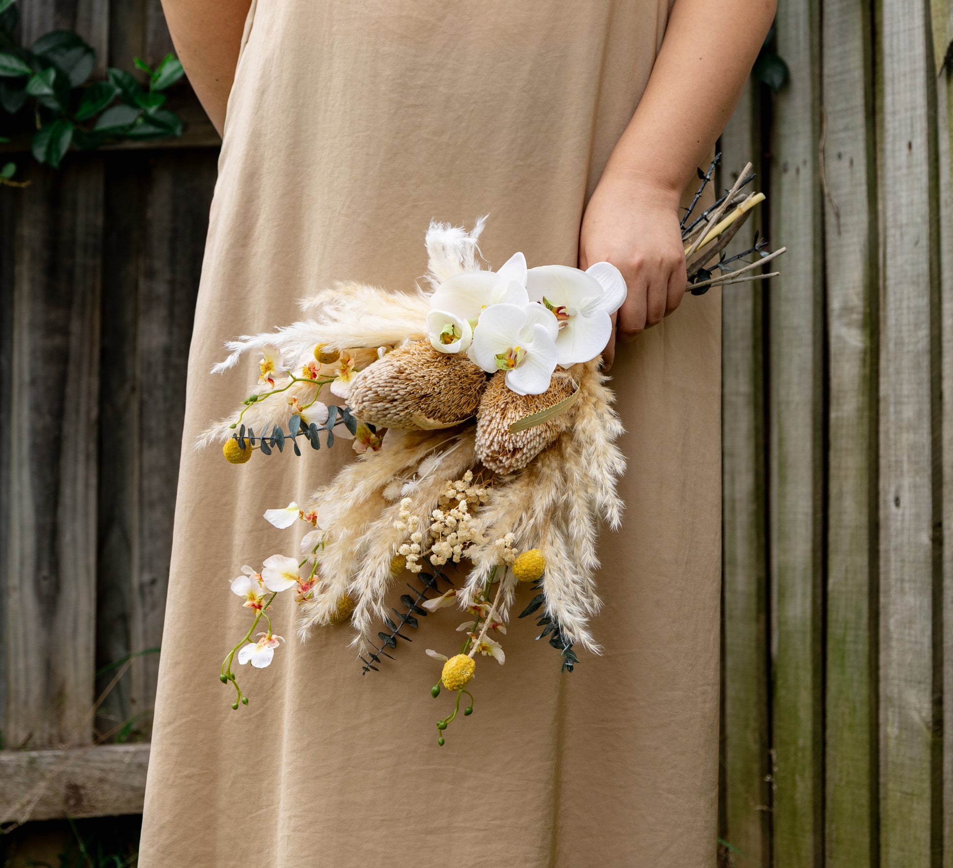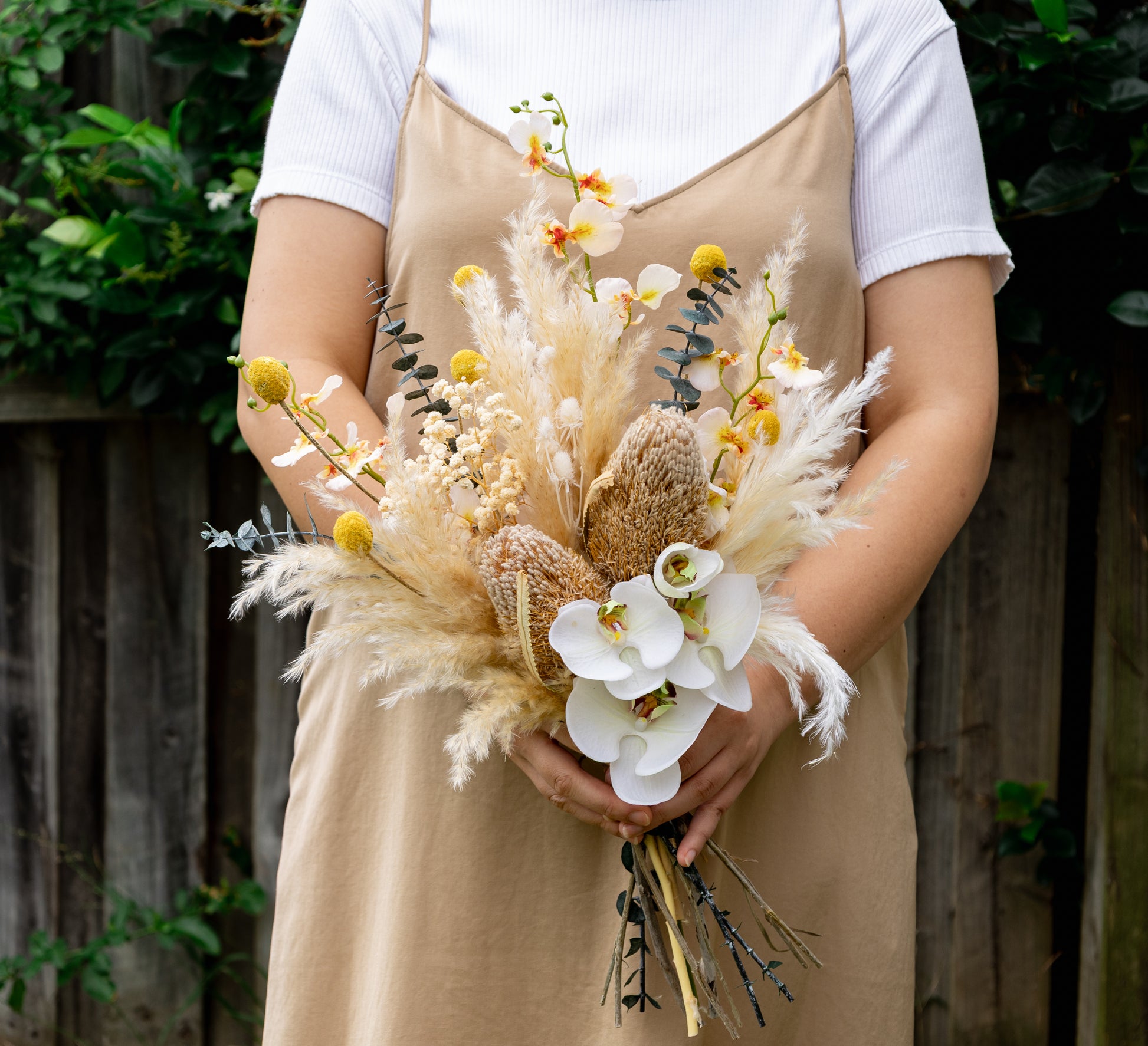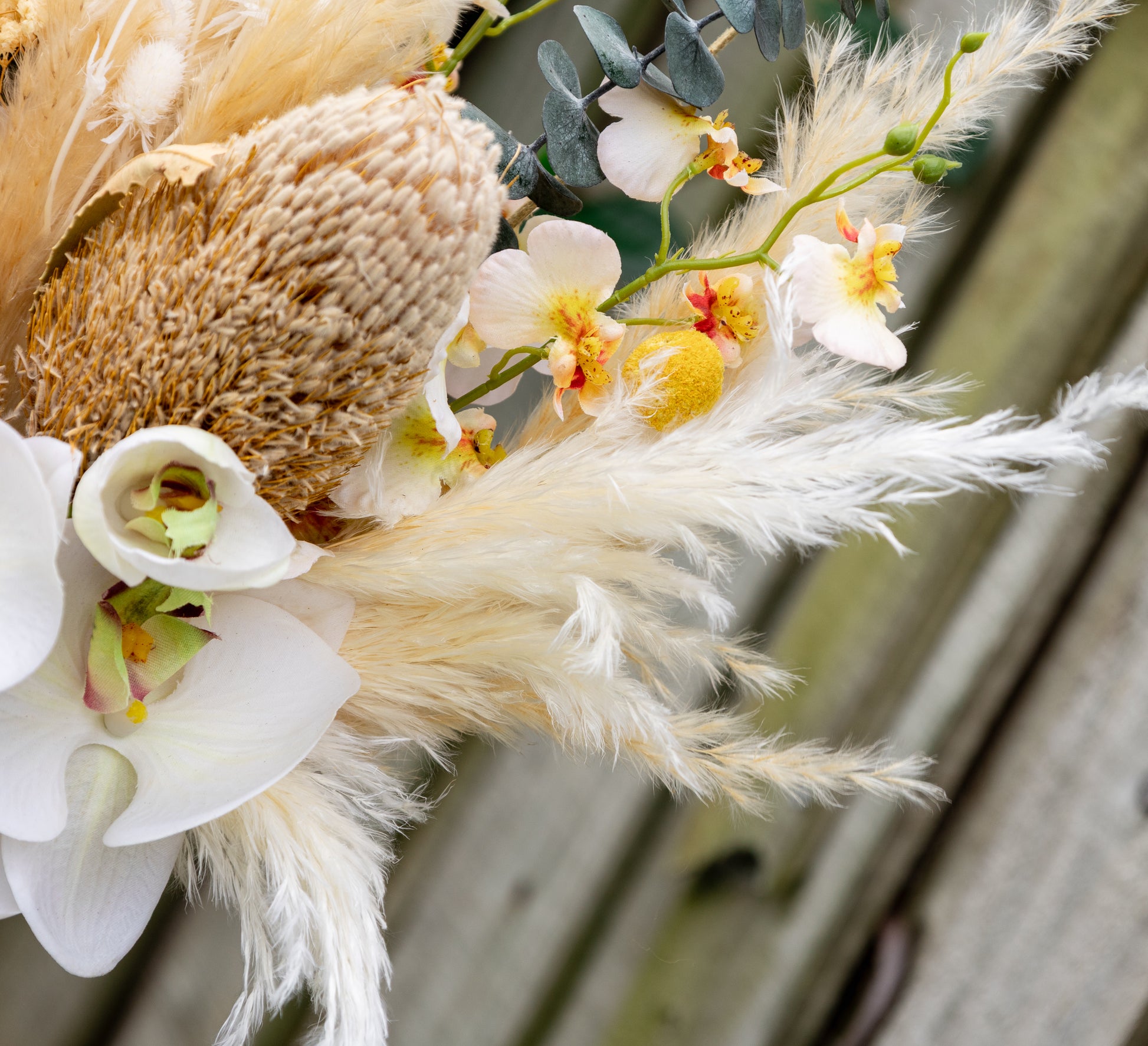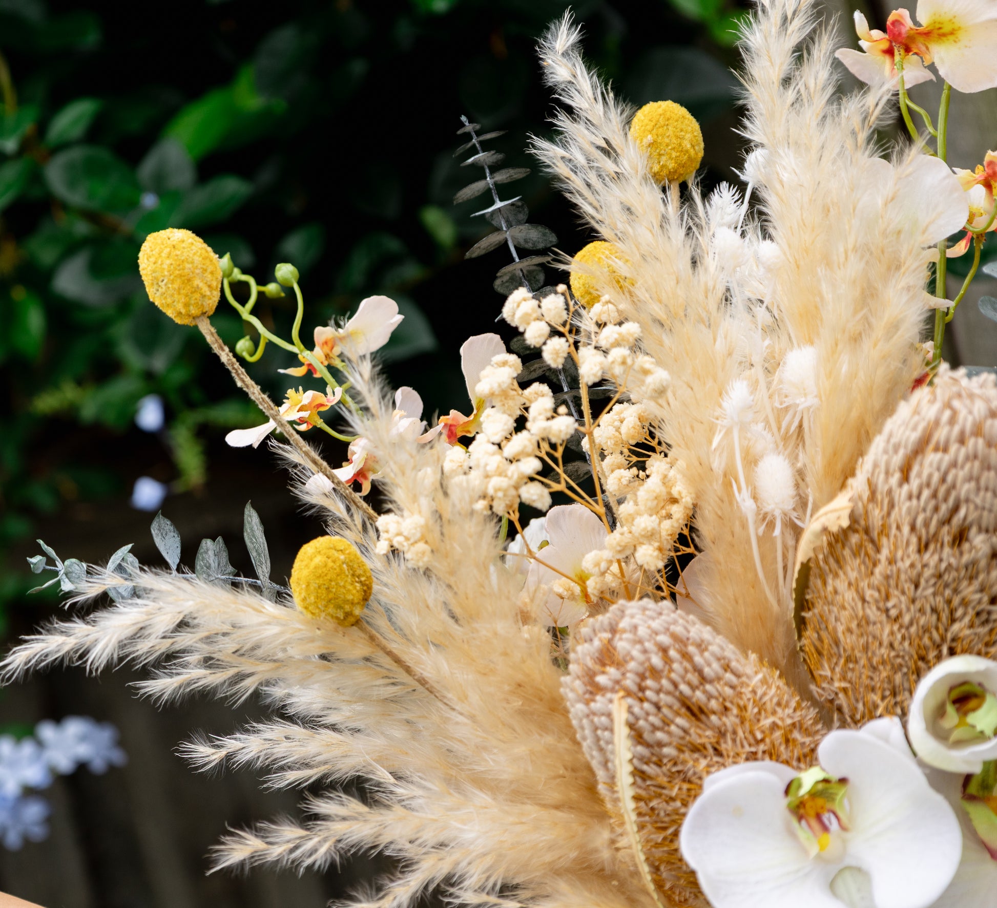 Earthy elegance meets modern romance in Desert Bloom, a dried flower bouquet that brings together native textures and soft orchid beauty. Featuring pampas grass, billy buttons, banksia, and ivory phalaenopsis orchids, this piece balances wild Australian elements with delicate luxury.