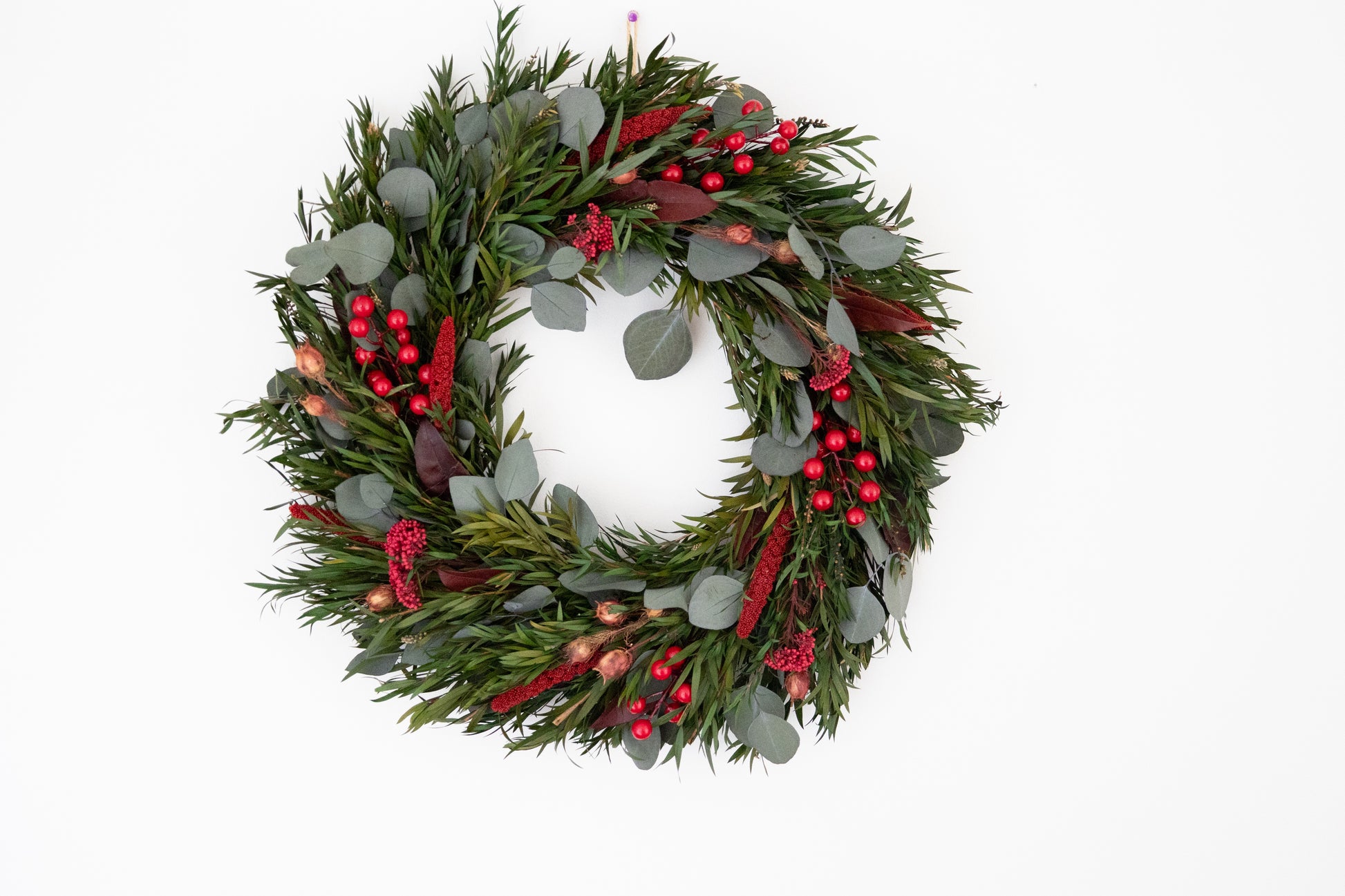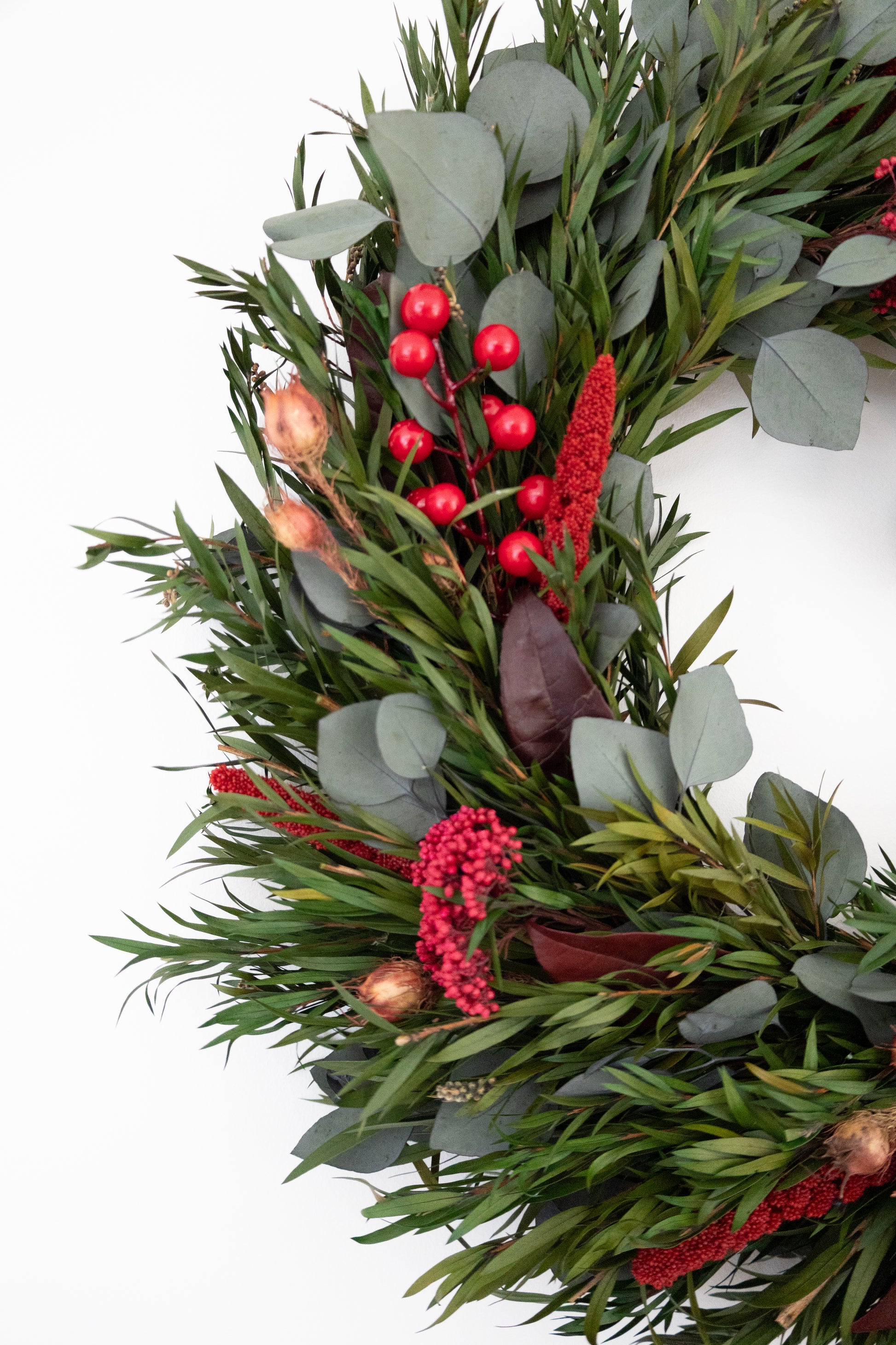 Add a festive pop of red to your Christmas décor with this handcrafted Red Berry Native Christmas Wreath. Made with lush preserved greenery, eucalyptus leaves, red berries and native botanical accents, this wreath blends a classic Christmas feel with an Australian native twist.
