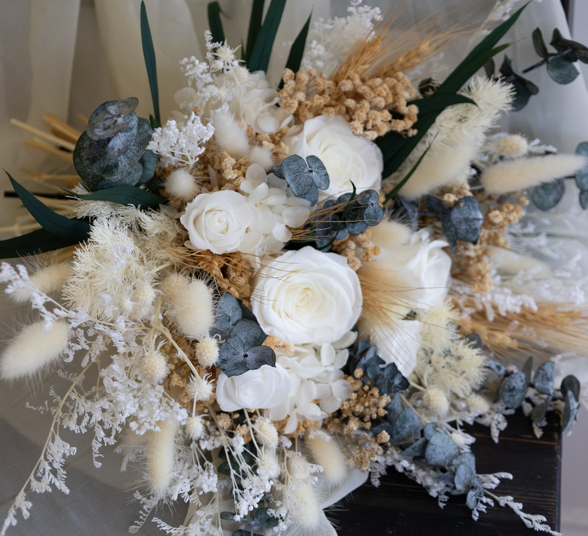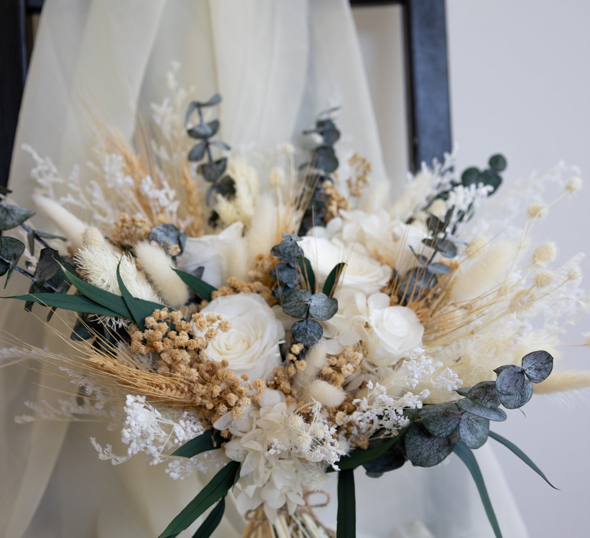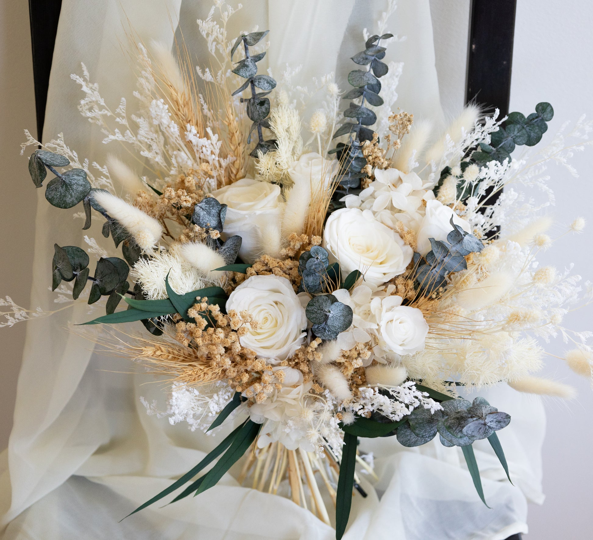 100% real dried and preserved flowers including white roses, eucalyptus, bleached ruscus, hydrangea, bunny tails, and natural textures.