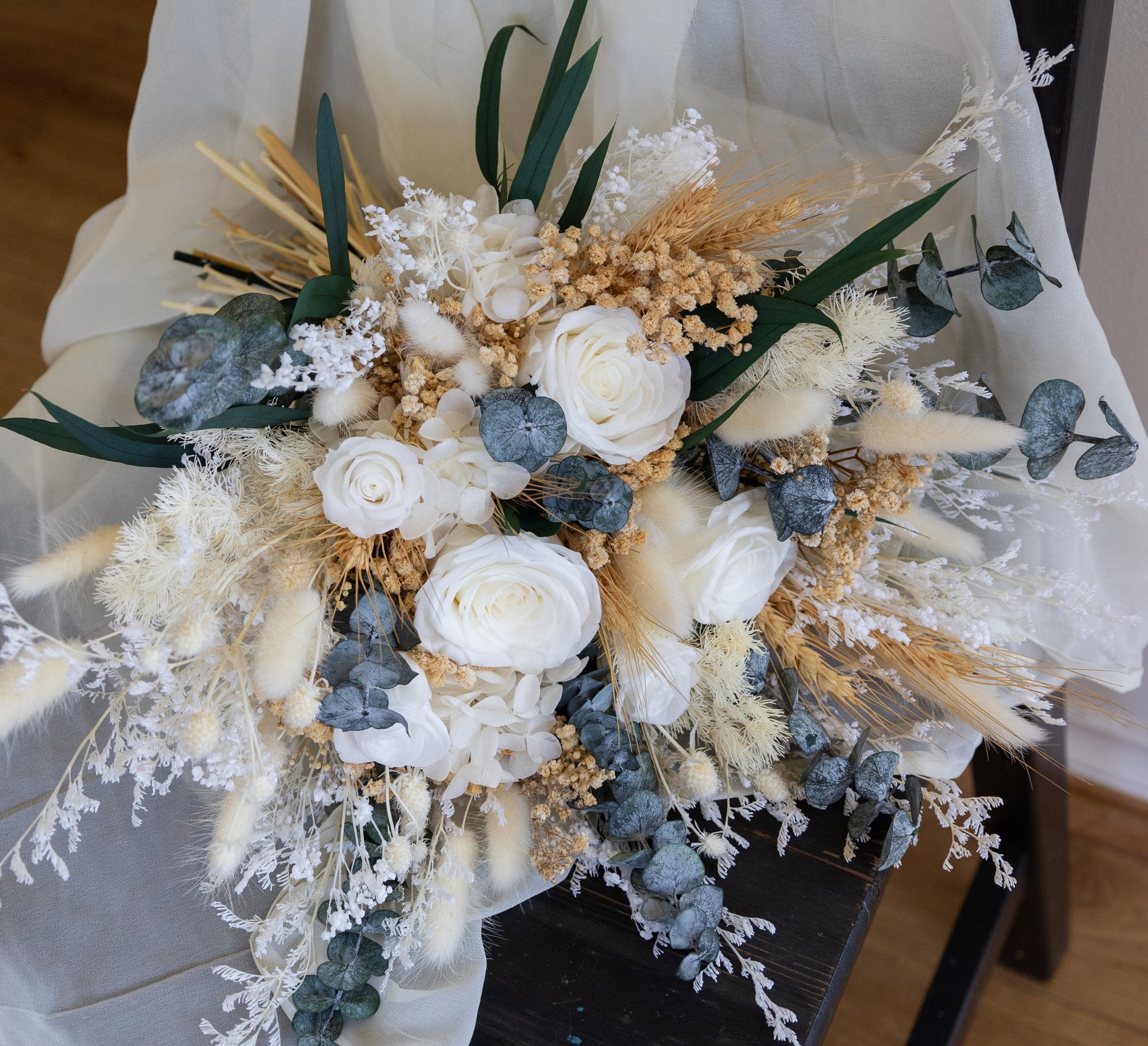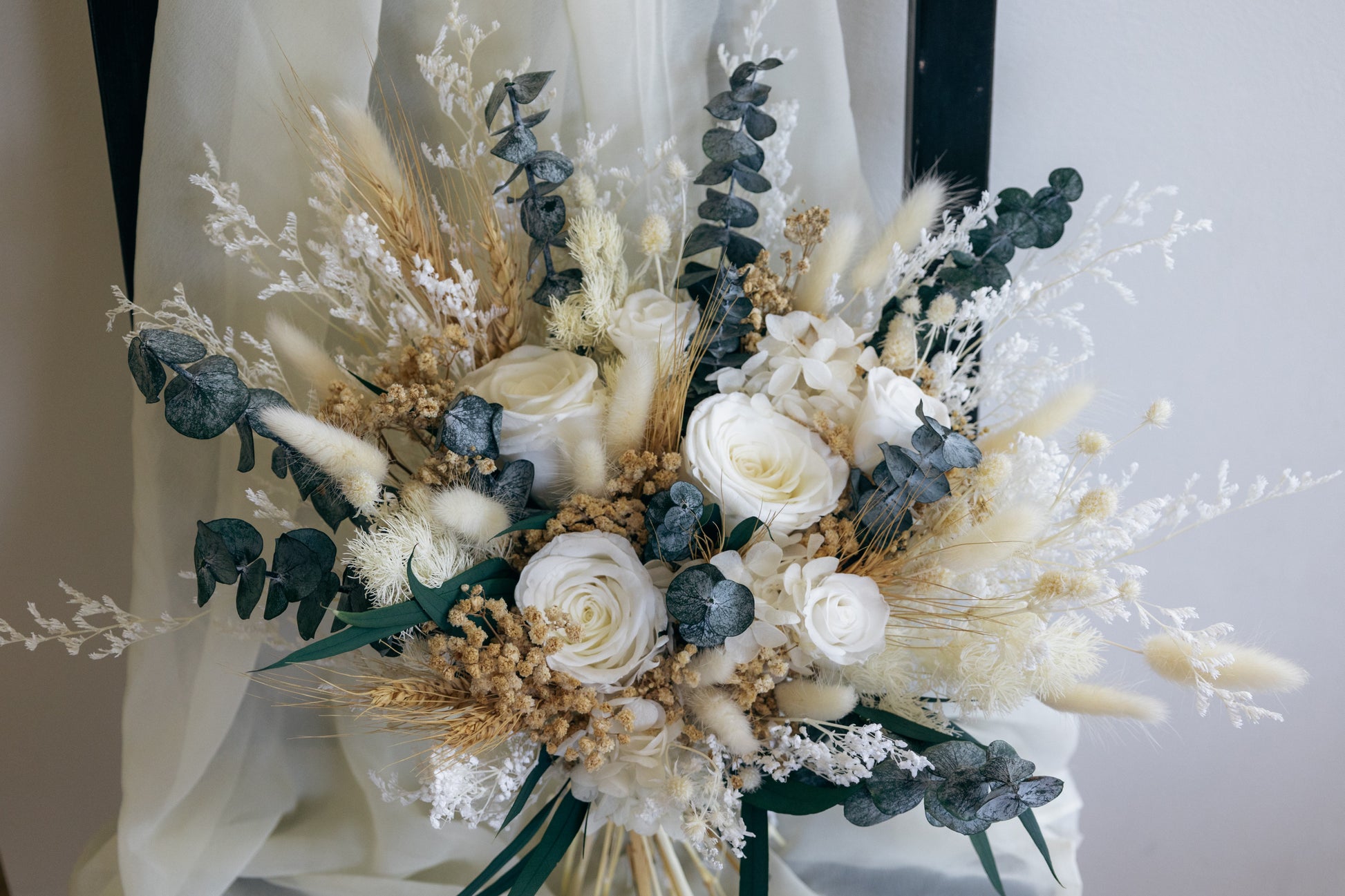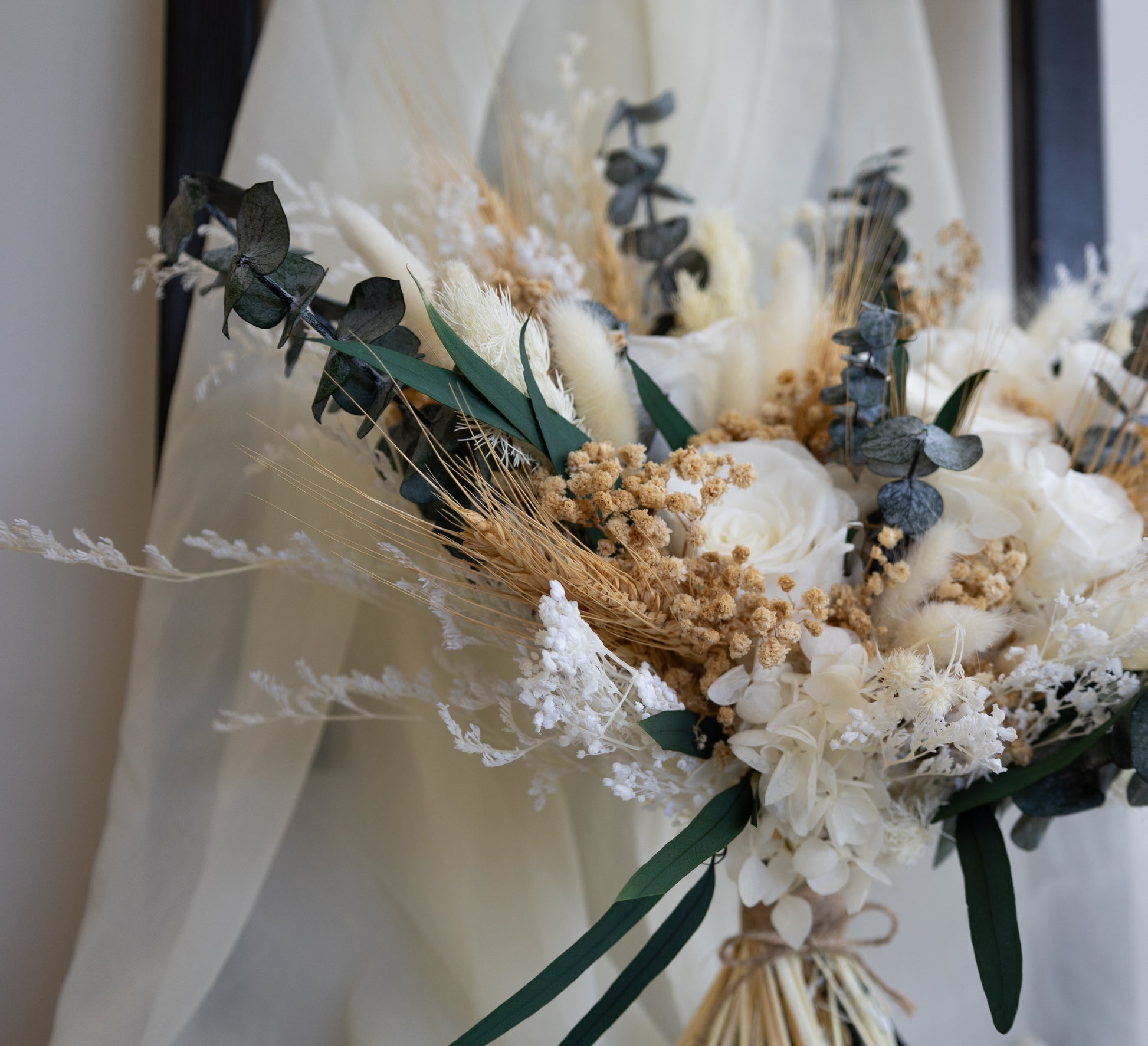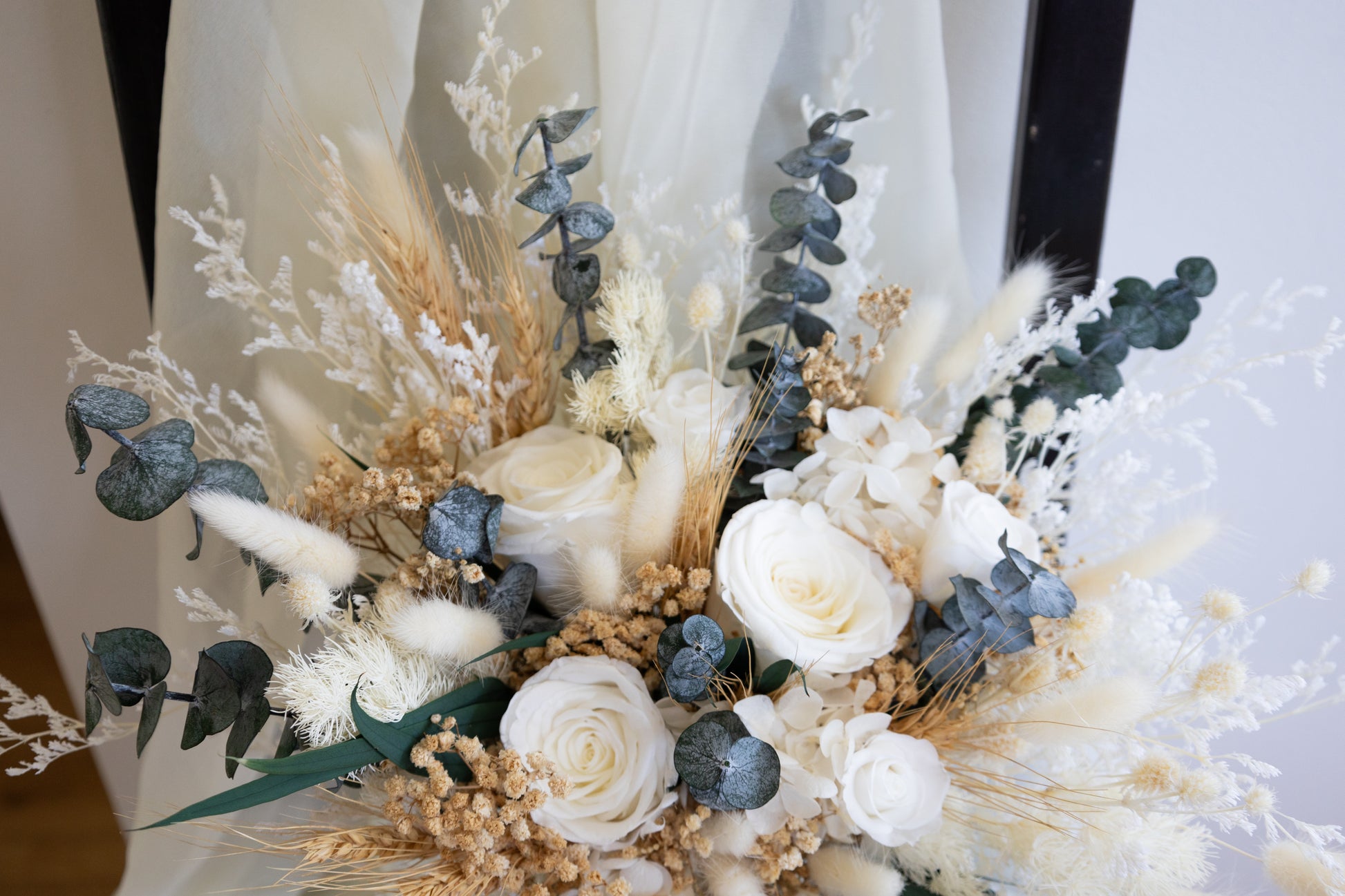 100% real dried and preserved flowers including white roses, eucalyptus, bleached ruscus, hydrangea, bunny tails, and natural textures.