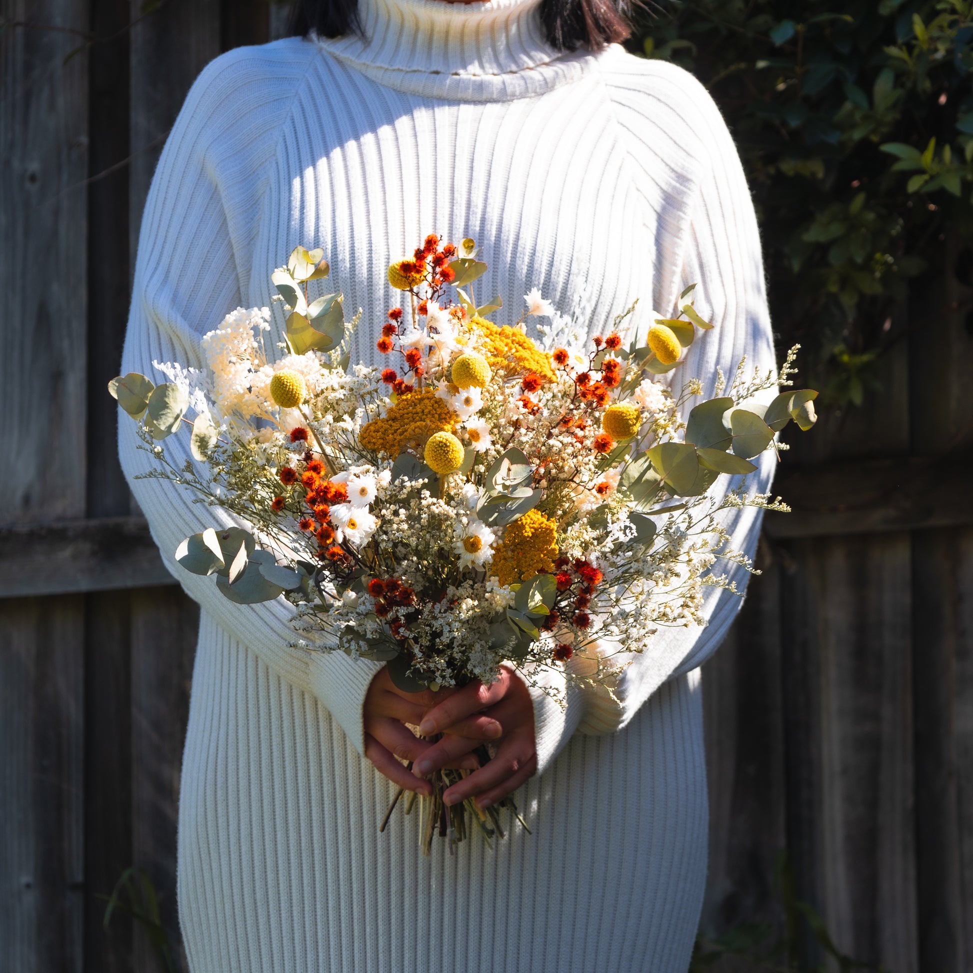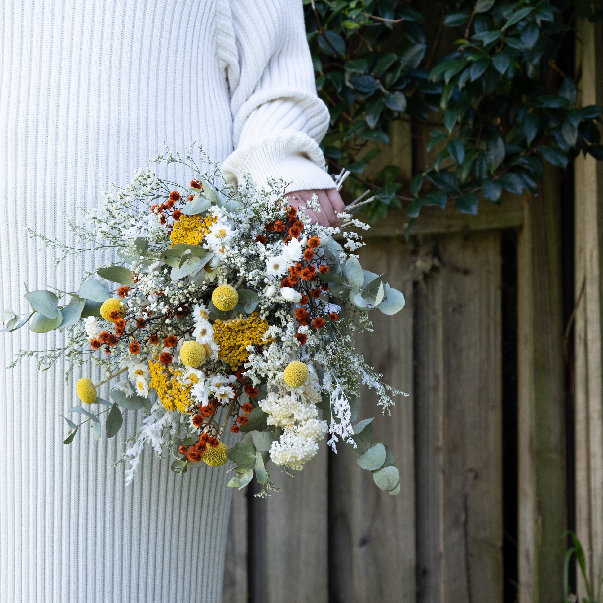 100% real dried and preserved flowers including strawflowers, banksia, craspedia (billy buttons), bleached ruscus, bunny tails, palms, and assorted foliage.
